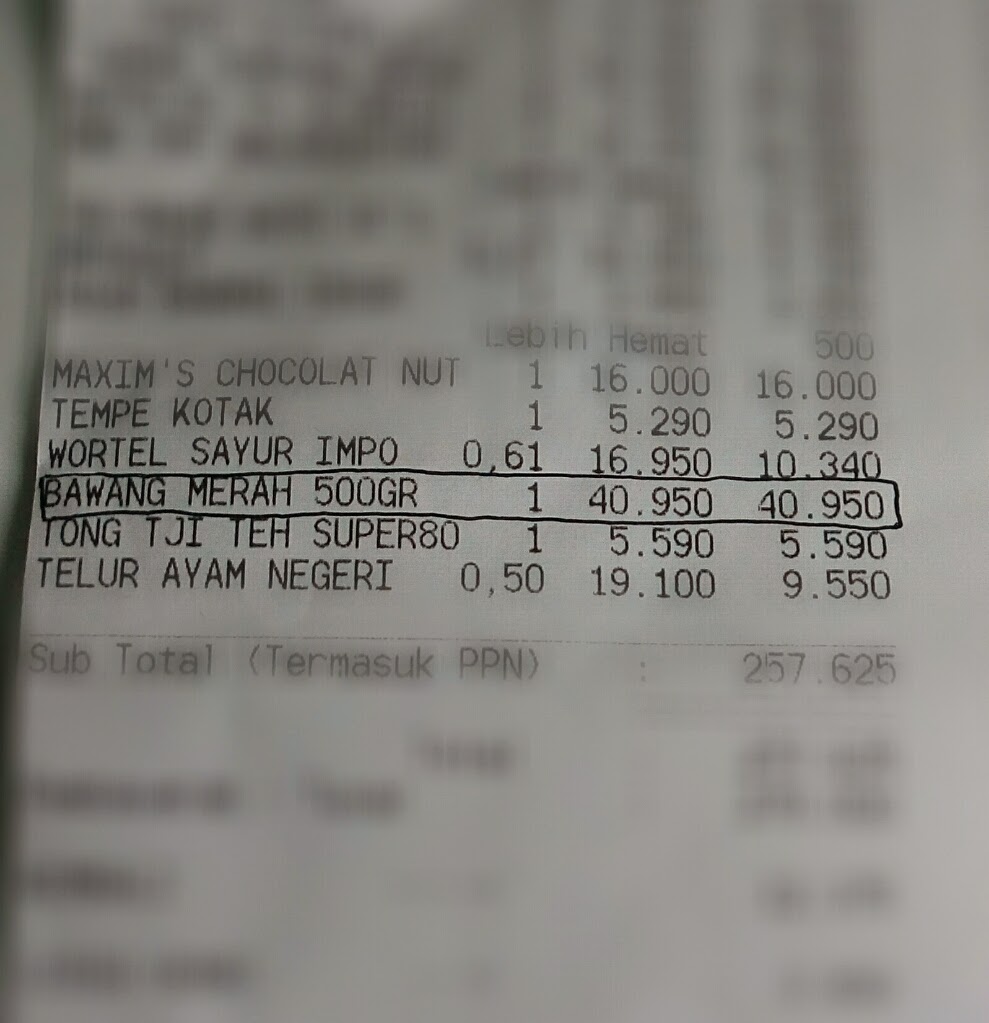 Alangkah kagetnya melihat struk belanja hari ini karena disitu tertera bawang merah 0,5 kg seharga 40 ribuan. OMG Helloooo .. Berarti harga per kg nya adalah 80 ribuan menyamai harga daging.